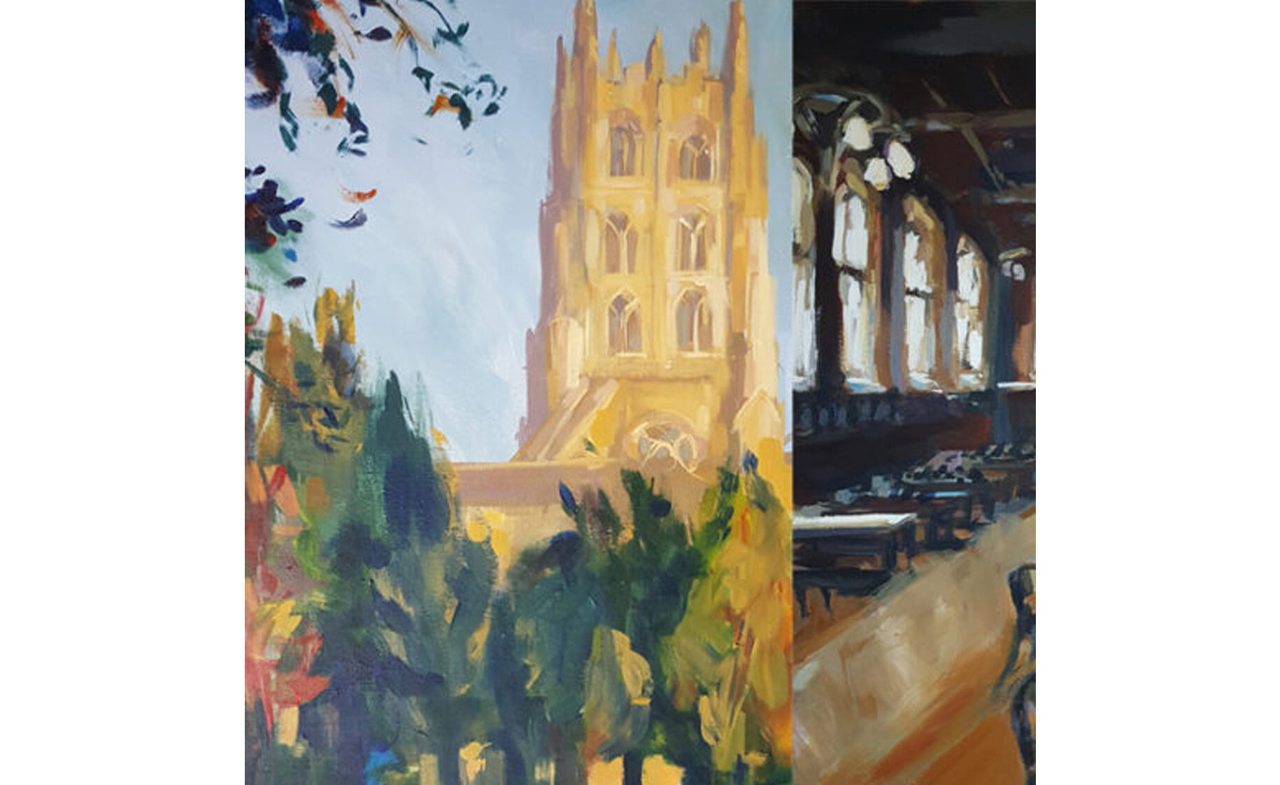 For the past nine months Rachel has been creating a series of paintings of Downside Abbey and the School moving through the summer, autumn and winter seasons. She has uniquely captured not only classic views of the Abbey and the School, such as the vesting benches in the Abbey or the School’s Harry Potter-style dining room, but also hidden treasures, such as the monastic gardens, that only a few have the opportunity to experience.