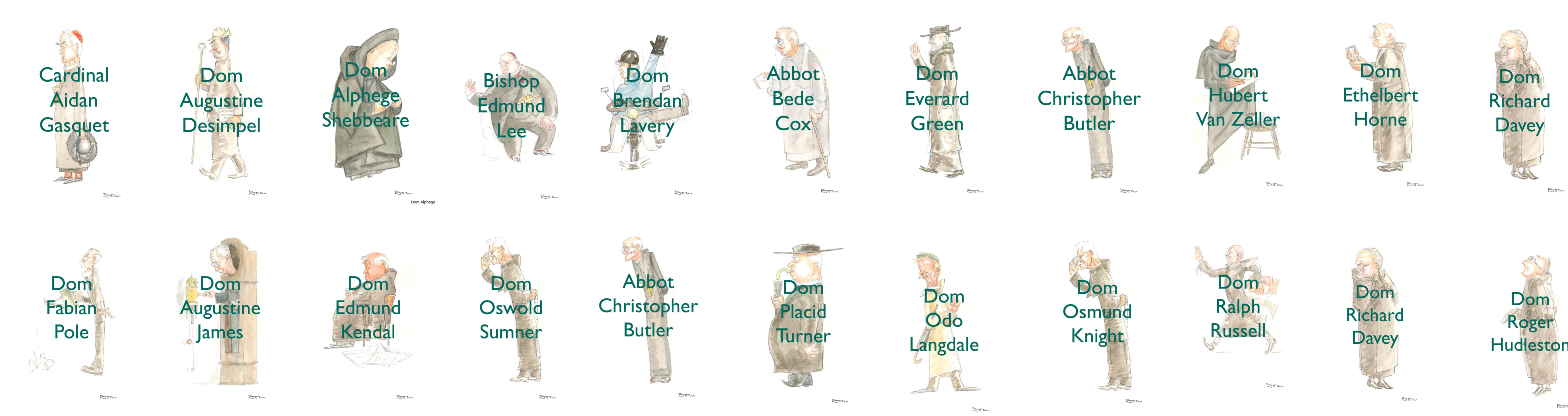 The sketches available here were drawn by Dom Hubert in the early 20th century and are caricatures of his monastic brethren of Downside Abbey. Each caricature reflects an aspect of the personality of the monk depicted; for example Dom Augustine James was a keen horologist, hence the drawing of him in a clock.