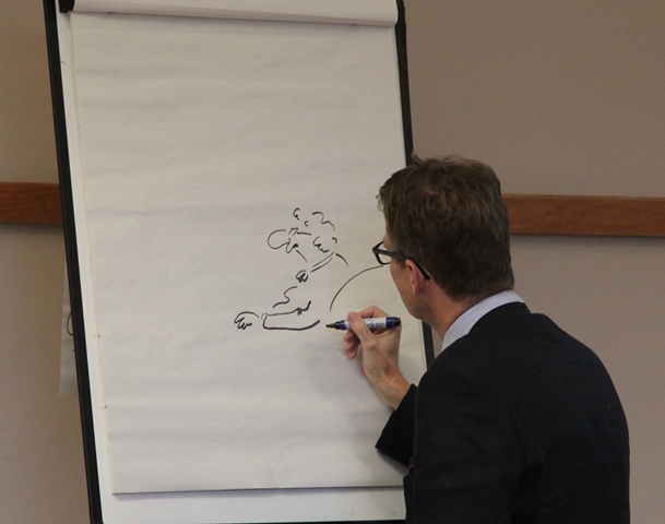 After a delicious breakfast Jonathan spoke about his work as a cartoonist and treated us to a demonstration! The resulting cartoon will be raffled at the Christmas Fair for the Friends of Downside.